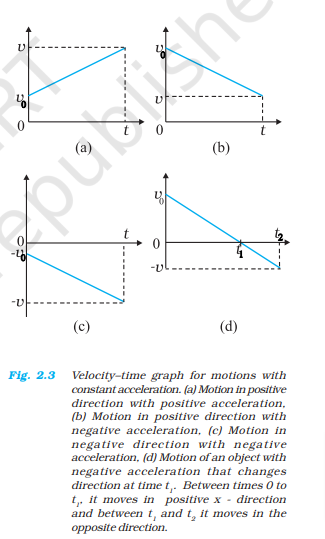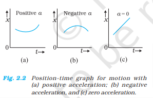 Velocity-time graph: In a velocity-time graph, the velocity of an object is plotted on the y-axis against time on the x-axis. The slope of the graph represents the acceleration of the object. A positive slope indicates positive acceleration, a negative slope indicates negative acceleration (deceleration), and a horizontal line indicates zero acceleration.